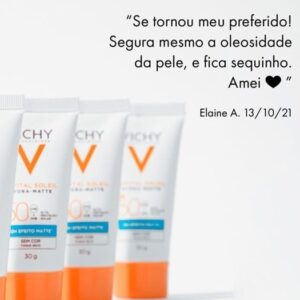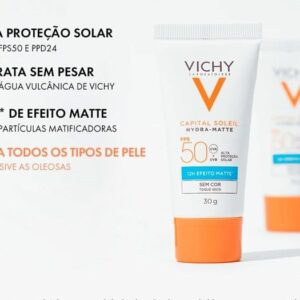 Indicado para todos os tipos de pele, inclusive oleosa, o protetor solar facial da Vichy Hydra-matte protege contra os raios UVA, sem deixar brilho residual, deixando um efeito matte por até 12 horas, hidratando sem pesar.